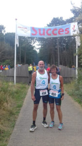 Ondertussen was het al warm geworden ,wat er ‘s ochtends niet zo uitzag….De eerste kilometers gingen goed maar in de duinen bij 8 km moest Riekie al lopen om goed te kunnen drinken (plastic zakjes). Daarna zwoegen door de duinen met behoorlijk wat tegenwind en warmte ging het allemaal niet meer zo soepel. Er waren genoeg verzorgingsposten met water en daar moest Riekie stoppen/wandelen om te drinken.