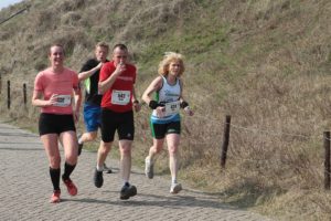 De 10 EM startte om 12.20 uur, met het deelnemersveld van bijna 1000 lopers was het lastig om je eigen tempo te lopen de eerste kilometers. Na ongeveer 2 kilometer kwamen we op het strand, of eigenlijk meer een zandpad achter het strand, dat zo smal was, dat je niet in kon halen. Een rustige start dus. Na het klimmetje naar de vuurtoren, stukje Badweg en dan rechts de duinen in kwam er wat meer ruimte en kon er beter worden doorgelopen. Dit was ook met name het warmste stuk met de wind in de rug.