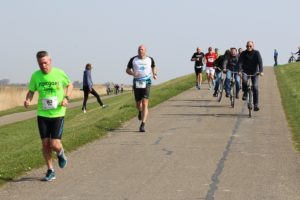 Douwe, Koert en Ans hadden zich in geschreven voor de 10 Engelse Mijlen. De deelnemers troffen het, de zon scheen volop en de temperaturen liepen op tot ruim 16 graden. Met het windje in de rug werd het zelfs nog aardig warm voor de lopers. De kledingkeuze was gemakkelijk gemaakt, korte broek en T-shirt. Ans koos zelfs voor het hemdje, wat later bleek, een prima keuze was.