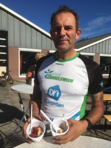 Dick en ik starten om 10 uur. Veel lopers voorop en daarna de fietsers, maar ik bleef bij Dick {achterin bij de fietsers ] en we starten net als nog meer lopers samen. De eerste 5.3 km liep ik en bij onze eerste lekkere stop ging Dick hardlopen. Net als de vorige keer in Westerbork om de 5 km wisselen en de laatste 2 km om de beurt 1.
