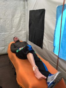 Als kers op de taart belandde Menno ook nog in de medische tent: een gat in zijn sok had ervoor gezorgd dat er een bloedblaar was ontstaan. Gelukkig had Menno hier geen last van gehad tijdens het lopen en kon deze behandeld worden – zoals op de foto te zien kon hij nog lachen.