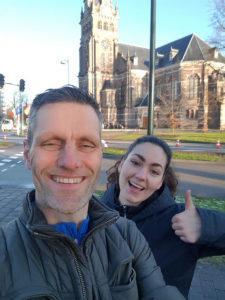 Om 11:15 startte de Mini-Marathon. “The Final Countdown” werd ingezet: we mochten van start! Het was prachtig weer: helderblauwe lucht en een lekker winters zonnetje. Een hele mooie route in de omgeving rondom Apeldoorn: veel groen, bos, een paar klimmetjes en leuke hotspots zoals de Apenheul en Paleis het Loo. Ik (Monique) liep door wat slaaptekort mentaal niet heel lekker, maar toch kunnen genieten onderweg. Geïnspireerd door het motto van de loop – “Je loopt sneller als je lacht!” – zette ik een