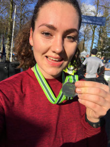 glimlach op en vlogen de kilometers voordat ik er erg in had voorbij. Mijn tactiek om tot de helft een beetje in te houden en vanaf 8 kilometer te versnellen heeft ervoor gezorgd dat ik ben gefinisht in een pr: 1:16:40. Ruim 10 minuten sneller dan vorig jaar! Mooi meetpunt.
